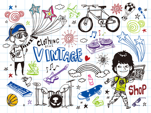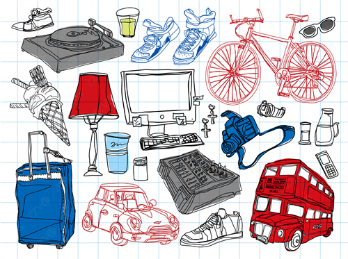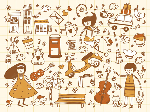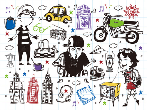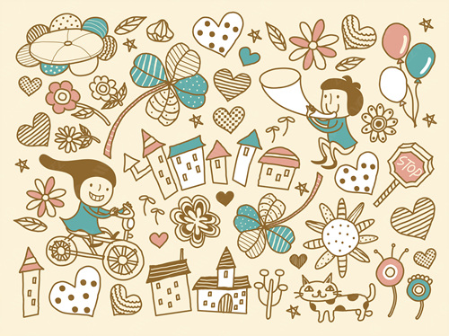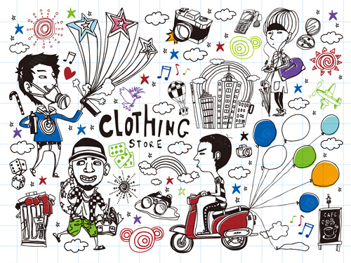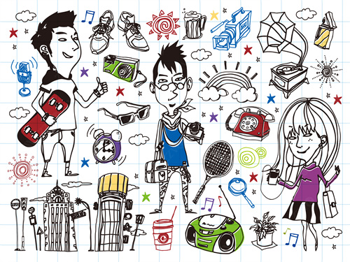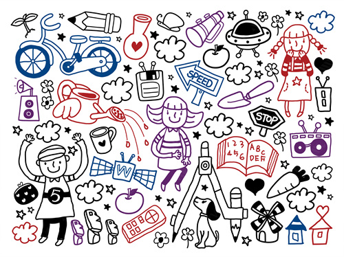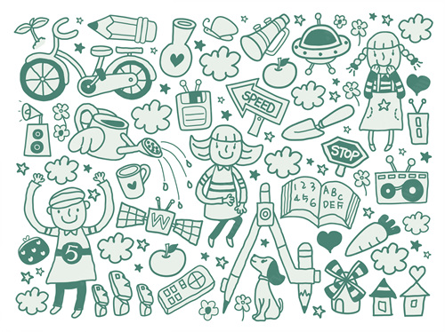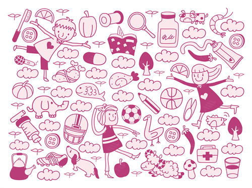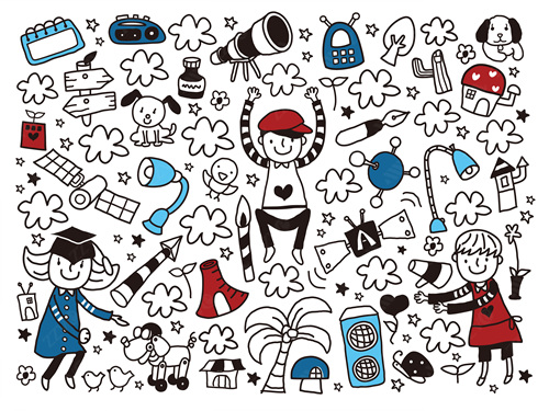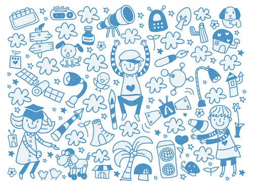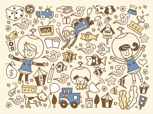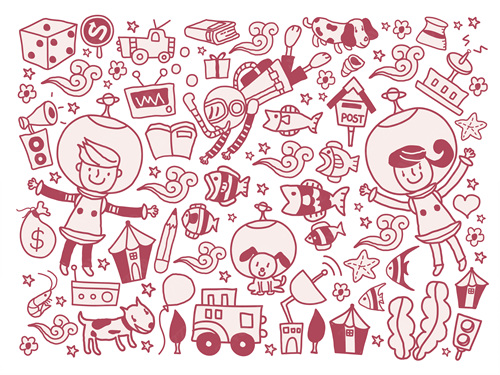 close-up, white background, cut out, white, color image, creative, digitally generated image, illustrate, illustration, imagination, imaginative, vector, color image, creativity, horizontal, three people, boys, girls, child, children only, balloon, speaker, satellite, animal, bird, tree, dog, casual clothing, togetherness, playing, flower, flying, dice, fish, star fish, car