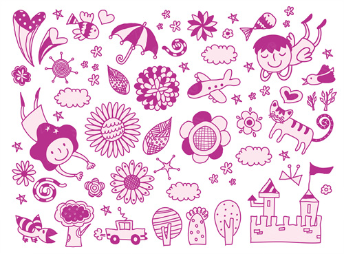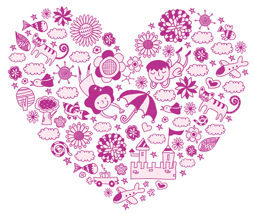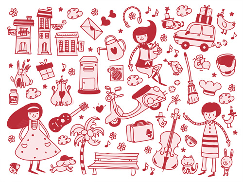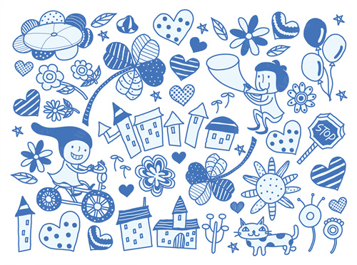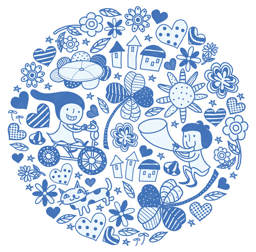 close-up, white background, cut out, white, color image, creative, digitally generated image, illustrate, illustration, imagination, imaginative, vector, color image, creativity, horizontal, two people, boys, girls, child, children only, flying, flower, cat, bird, two animal, house, megaphone, vehicle, travel, transportation, balloon, togetherness, casual clothing, front view, cycle