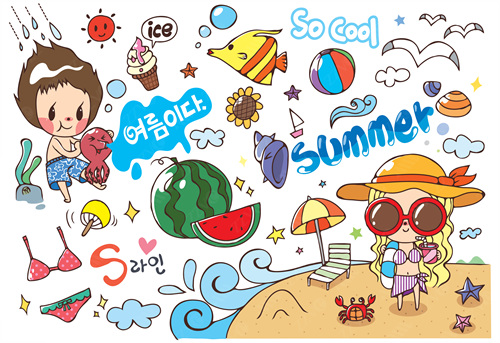 horizontal, colored background, color image, illustration and painting, people, three people, vector, child, childhood, girls, boys, happiness, bonding, love, cheerful, joyful, enjoyment, smiling, outdoors, cloud, togetherness, playing, rabbit, bear, animal, cute, playful, leisure activity, sand, reading, book, lying down, dinosaur, rubber tube, umbrella, riding