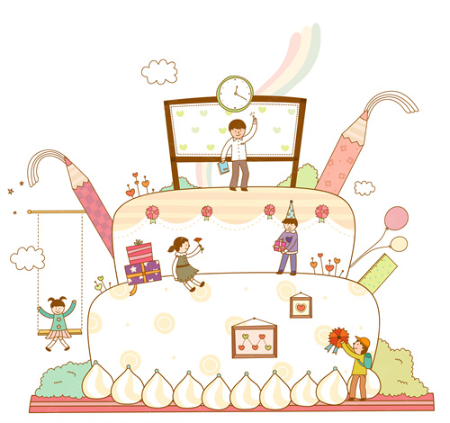 cone hat, swing, tree, rainbow, box, crayon, birthday, cream, gift, gift box, teacher, class, Teacher's Day, clocks, picture frames, pencil, carnation, cakes, balloons, school, student