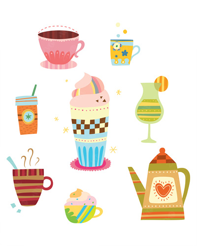 sugar lump, straws, lemon, coffee mugs, pattern, patterns, people, fresh cream, stripe, sticks, spoons, illustrations, paper cups, kettle, stripes, cocktails, coffee, coffee cups, tumblers, tea, ice cream, patterns, hearts, white background, tea