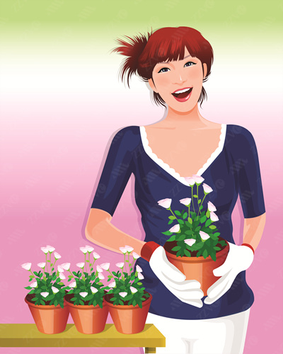 Bangs, Care, Casual Clothing, Clipart, Color, Colour, Computer Graphics, Digitally Generated Image, Flower, Front View, Glove, Graphics, Growth, Holding, Illustration, Indoors, Lifestyles, Looking At Camera, Mouth Open, One Person, One Woman Only, Woman, Female, Plant Life, Portrait, Potted Plant, Red Hair, Standing, Table, Text, Top, Waist-Up, Weekend Activities, Western Script, Vector