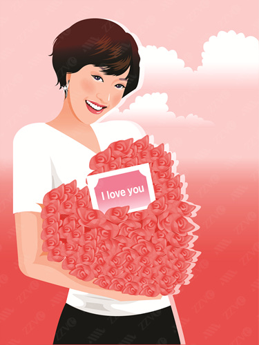 Bouquet, Clipart, Color, Colour, Computer Graphics, Day, Digitally Generated Image, Flower Arrangement, Front View, Graphics, Greeting Card, Happiness, Joy, Excitement, Excited, Cheerful, Happy, Heart Shape, Holding, Illustration, Lifestyles, Looking At Camera, Love, One Person, One Woman Only, Woman, Female, Outdoors, Portrait, Romance, Rose, Short Hair, Smiling, Standing, Text, Waist-Up, Western Script, Vector