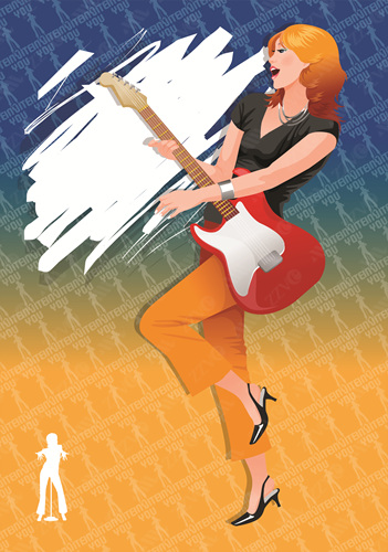 Brown Hair, Clipart, Color, Colour, Computer Graphics, Dancing, Digitally Generated Image, Festival, Front View, Full Length, Graphics, Guitar, Illustration, Indoors, Lifestyles, Long Hair, Medium-Length Hair, Music, Entertainment, Musical Instrument, One Person, One Woman Only, Woman, Female, Pedal Pushers, Performance, Playing, Singing, Hobbies, Skill, Standing, Stringed Instrument, Text, Top, Western Script, Vector