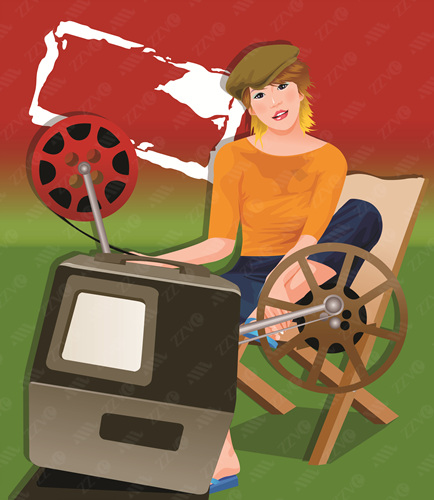 Arts Culture And Entertainment, Brown Hair, Cap, Casual Clothing, Chair, Clipart, Color, Colour, Computer Graphics, Digitally Generated Image, Entertainment, Film Festival, Film Industry, Film Projector, Film Reel, Front View, Full Length, Graphics, Illustration, Indoors, Industry, Looking At Camera, Number, One Person, One Woman Only, Woman, Female, Portrait, Short Hair, Sitting, Technology, Vector