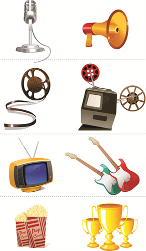 Carton, Clipart, Close-Up, Color, Colour, Computer Graphics, Computer Icon, Digitally Generated Image, Film Projector, Film Reel, Food And Drink, Nutrition, Nourishment, Graphics, Group Of Objects, Guitar, Icon, Illustration, Indoors, Megaphone, Microphone, Music, Entertainment, Musical Instrument, Hobbies, Nobody, Popcorn, Still Life, Stringed Instrument, Studio Shot, Technology, Television, Trophy, Variation, White Background, Assortment, Film Industry, Vector